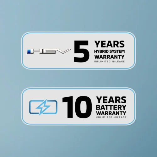 รับประกัน 5 ปีแรกทั้งระบบแบบไม่จำกัดระยะทางประกอบด้วย แบตเตอรี่ขับเคลื่อน ชุดควบคุมพลังงานไฟฟ้าขับเคลื่อน มอเตอร์ไฟฟ้าขับเคลื่อนล้อหน้า เครื่องกำเนิดไฟฟ้า ระบบส่งกำลัง (TRANSAXLE) ชุดจัดการแบตเตอรี่ และบริษัทฯ ขยายระยะเวลารับประกันเฉพาะแบตเตอรี่ไฮบริดเพิ่มอีก 5 ปี (ตั้งแต่ปีที่ 6-10) ทั้งนี้เงื่อนไขการขยายเวลารับประกันดังกล่าวเป็นไปตามบริษัทฯ กำหนด โปรดศึกษารายละเอียดเพิ่มเติมในหนังสือคู่มือการใช้รถยนต์
