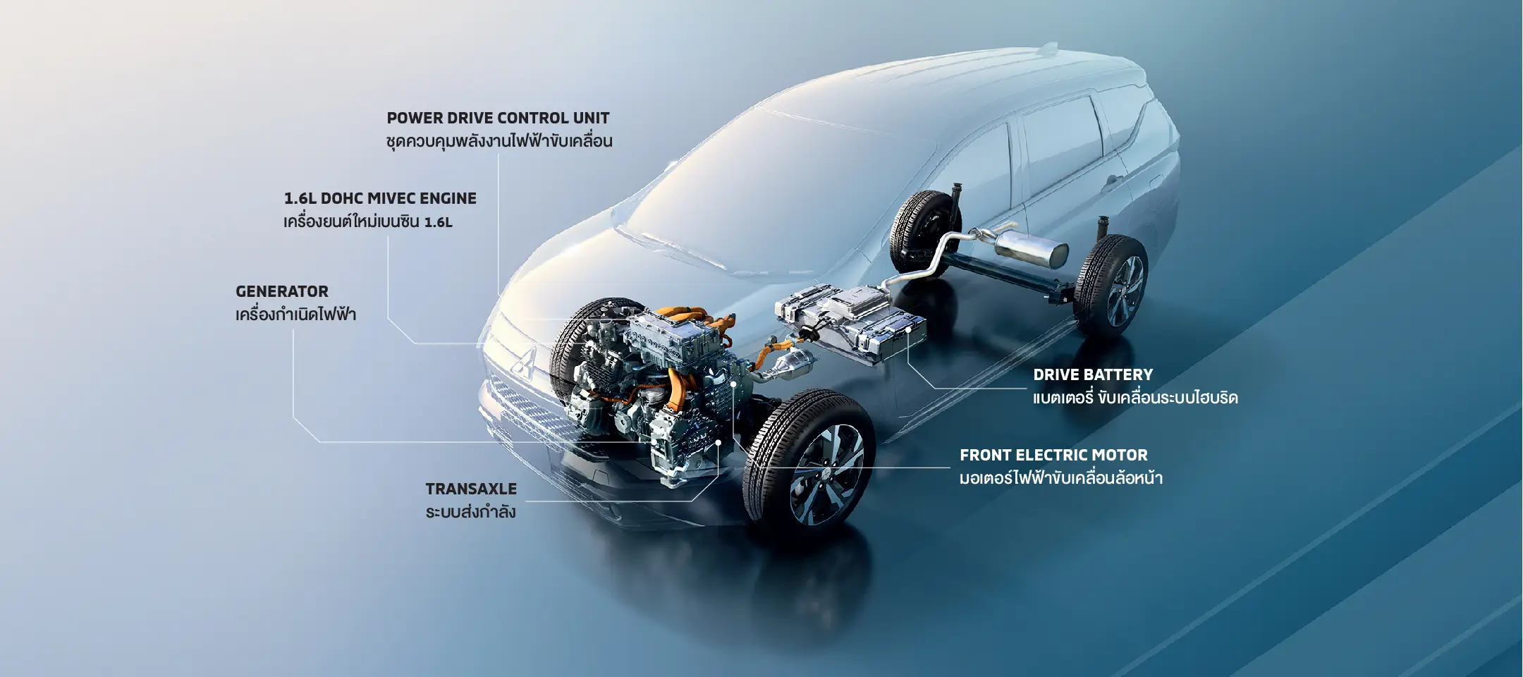 ขับเคลื่อนเต็มกำลังด้วยขุมพลังไฮบริด เต็มรูปแบบ ใหม่! ครั้งแรกของมิตซูบิชิ มอเตอร์ส ผสานการทำงานของเครื่องยนต์ 1.6L MIVEC และมอเตอร์ไฟฟ้ากำลังสูง ปรับเปลี่ยนการทำงานของ ระบบขับเคลื่อนอัตโนมัติ ตั้งแต่การออกตัว การขับขี่ความเร็วตํ่า และความเร็วสูง เพื่อเพิ่มประสิทธิภาพ สูงสุดในทุกจังหวะของการเดินทาง พร้อมทั้งอัตราสิ้นเปลืองเชื้อเพลิงที่ดีขึ้น